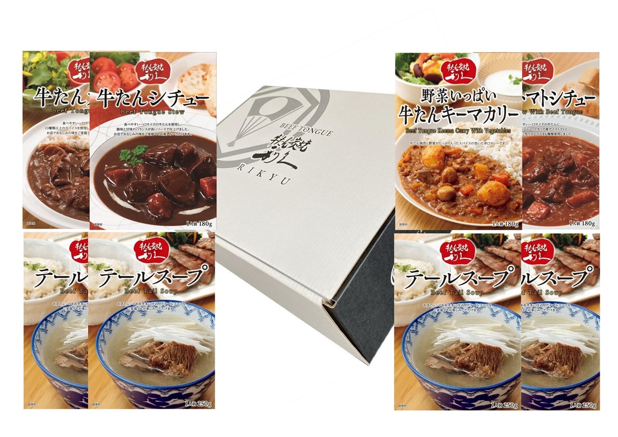 - 牛たんカレー180g×1、牛たんシチュー180g×1、野菜いっぱい牛たんキーマカリー180g×1、牛たんトマトシチュー180g×1、テールスープ250g×4