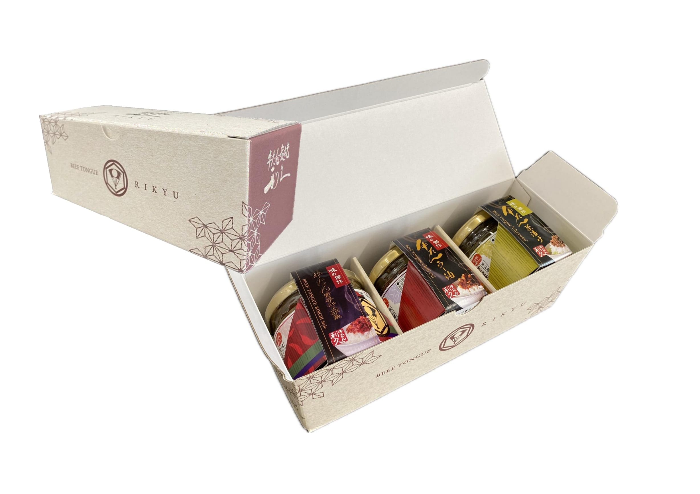 利久の牛たんを使用し、ごはんとの相性抜群の3種類の味が楽しめるセットです。化粧箱入りでちょっとした贈り物にも喜ばれます。