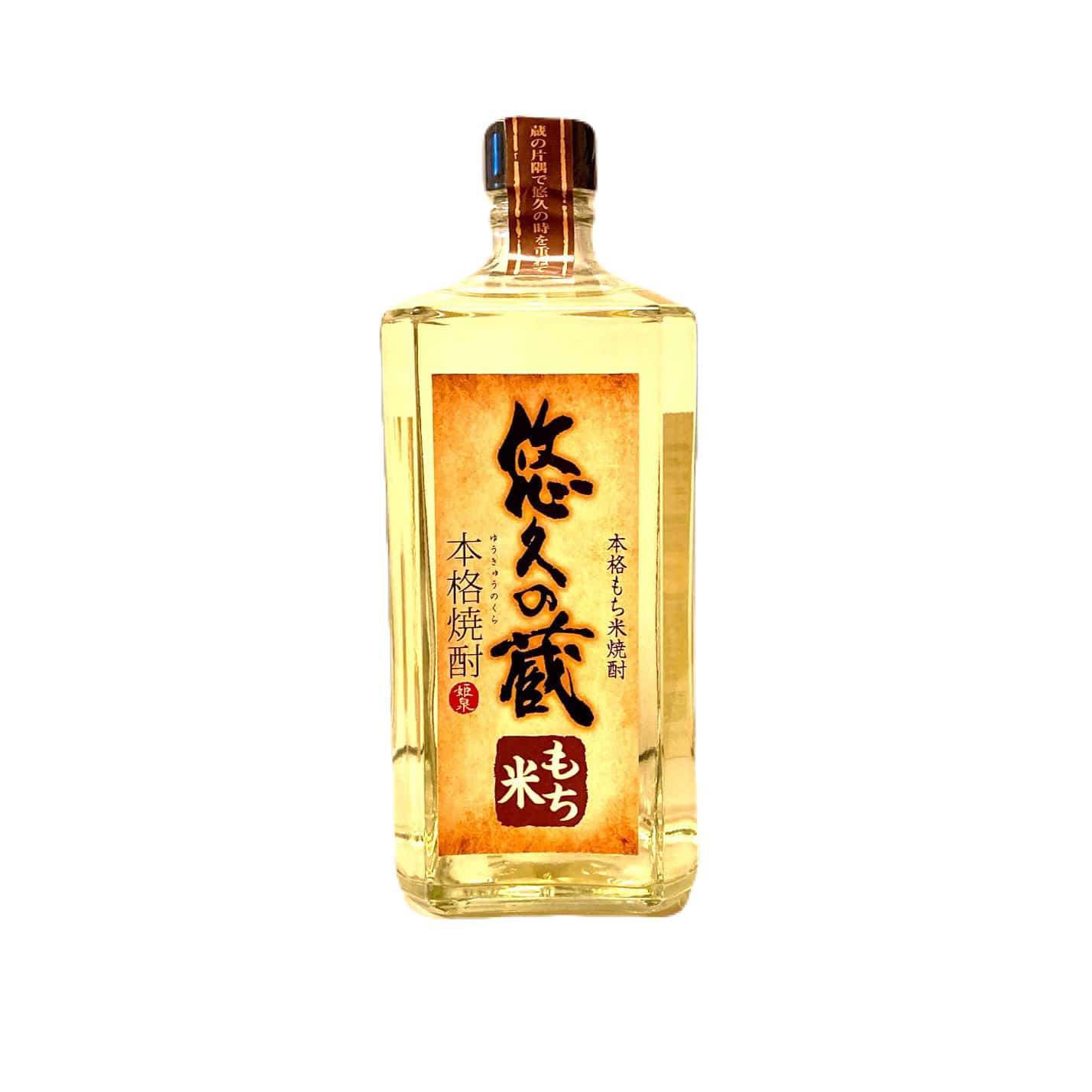 国産のもち米を使用し、黒麹仕込みにて造られたもち米焼酎の原酒を木製の樫樽にて静かに貯蔵、熟成させ、蔵の対岸の山より湧き出る湧き水を使用し、割水を行いました。琥珀色したもち米特有の甘みと芳醇な香りのある深い味わいが特徴です。