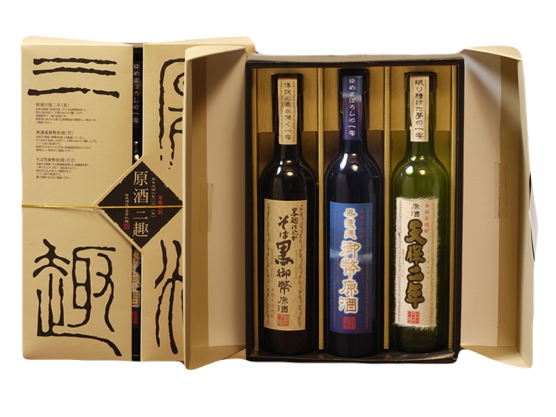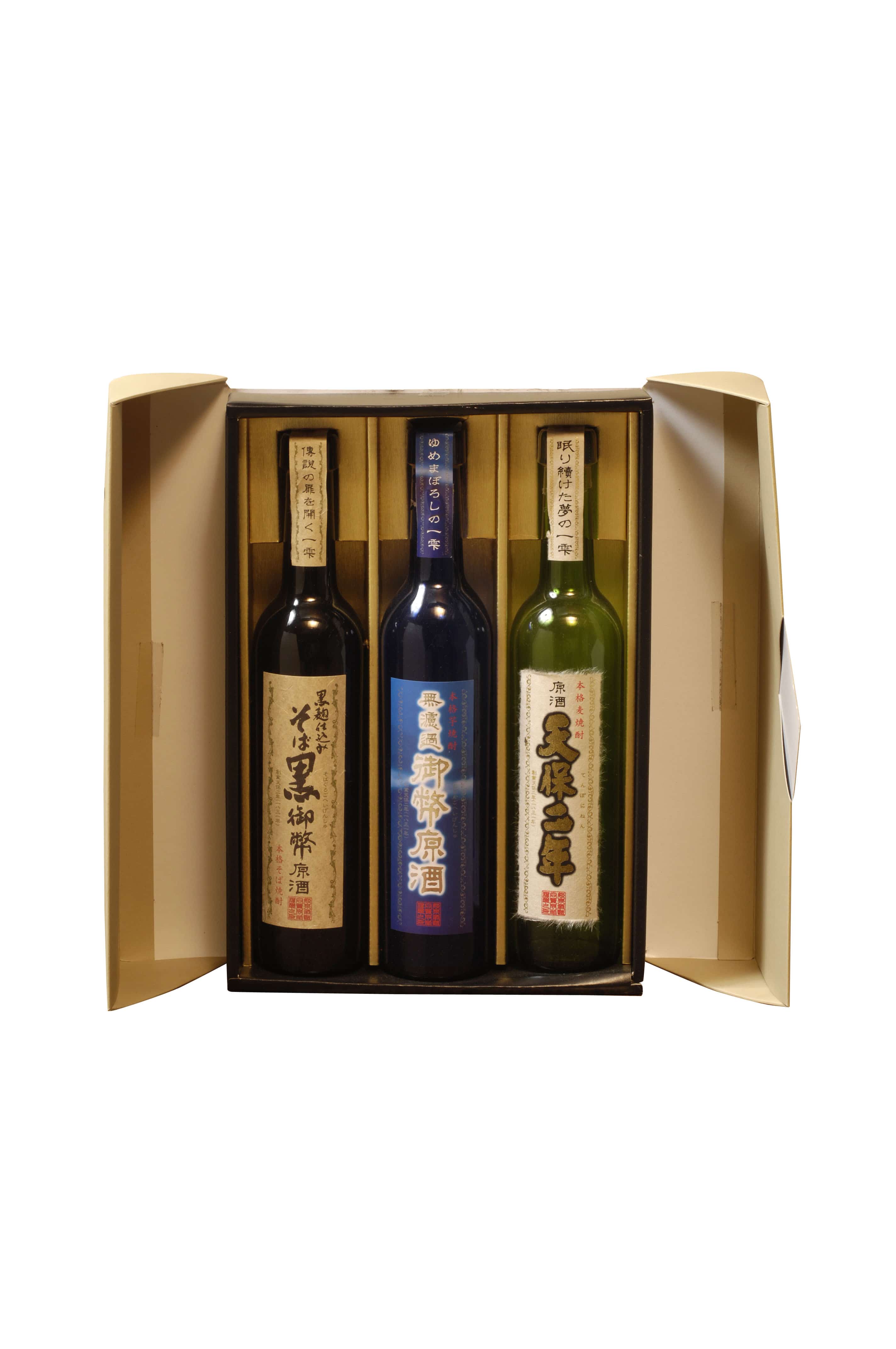 - 内容量:500ml×3 本格芋焼酎 無濾過御幣原酒38度500ml 本格麦焼酎 天保二年原酒42度500ml 本格そば焼酎 そば黒御幣37度500ml 化粧箱入り 重量:3kg