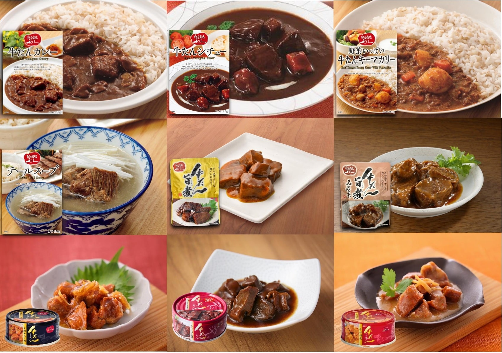 - 牛たんカレー・牛たんシチュー・テールスープ・牛たん旨煮・牛たん旨煮みそ味:牛たん加工品(国内製造)、野菜いっぱい牛たんキーマカリー:牛たん(オーストラリア)、牛たん大根おろし煮・牛たん辛味噌煮・牛たん赤ワインソース煮:牛たん(輸入)