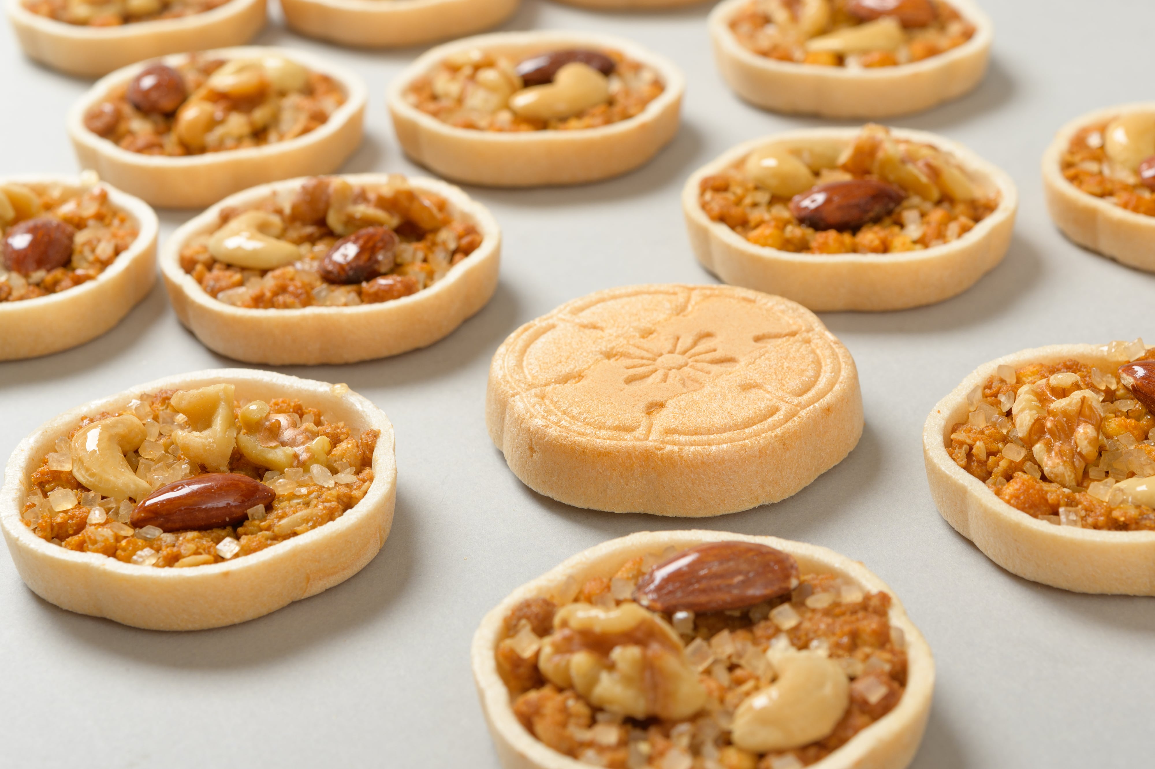 燦樂:米粉の最中だねに発酵バター、キャラメルテイストの琥珀生地に3種のナッツをトッピング。