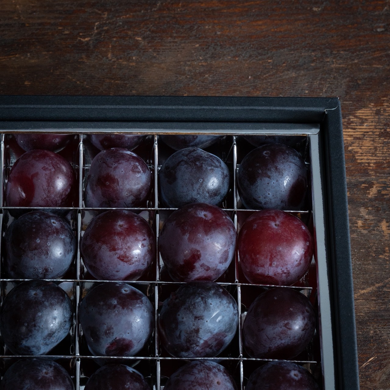 一粒が、完成された芸術品。岡山県が育んだニューピオーネの中から、形・大きさ・色ツヤのすべてにおいて「一級品」のみを厳選。36粒の輝きを、漆黒のギフトボックスに閉じ込めました。