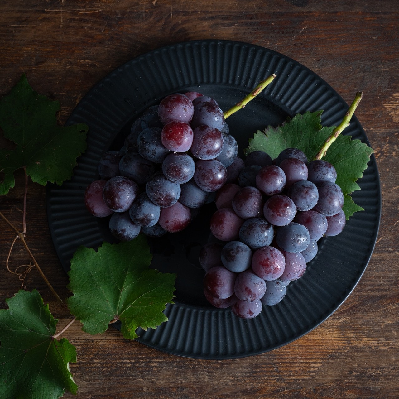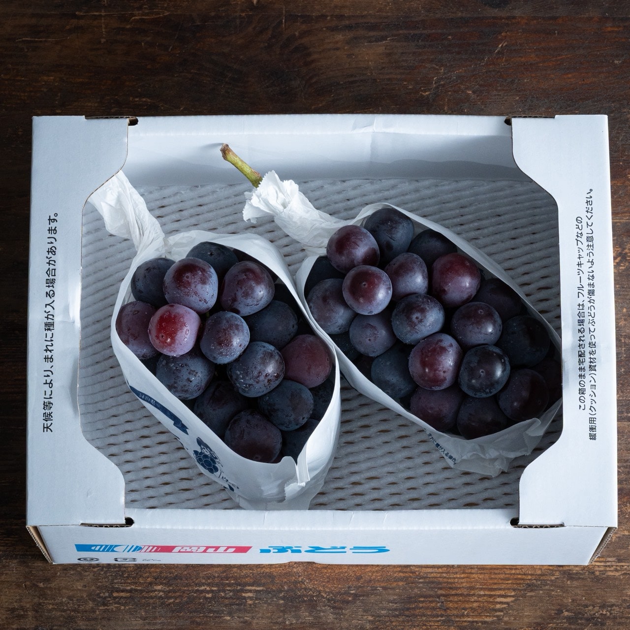 手に取った瞬間に伝わる、ずっしりとした重量感と張り。深い紫黒色に輝く大粒の房は、まさに贈答品の最高峰です。