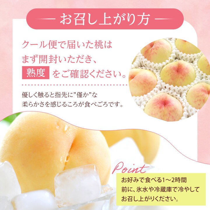 口に含んだ瞬間に溢れ出す芳醇な果汁と、とろけるような緻密な果肉、そして気品ある甘い香り。「桃の女王」の名にふさわしい極上の口どけを、最も美味しい旬の時期に産地からお届けします。大切な方への贈り物や、自分への贅沢なご褒美に、本物の味わいをご堪能ください。