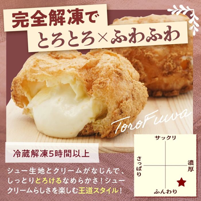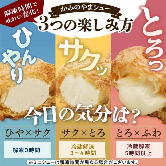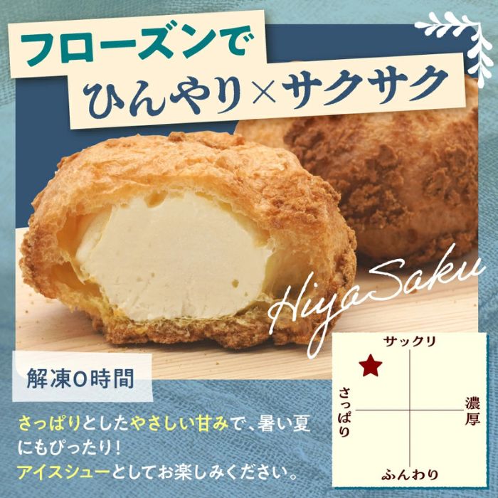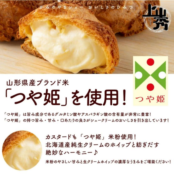 かみのやまシューは、山形県産つや姫米粉を使用したシュー生地に、やさしい甘さのカスタードクリームをたっぷり詰めた定番スイーツです。焼き上げ後すぐに冷凍することで、おいしさをそのまま閉じ込めました。