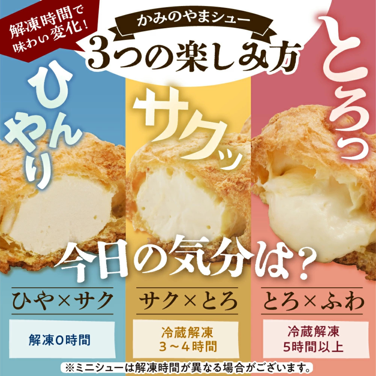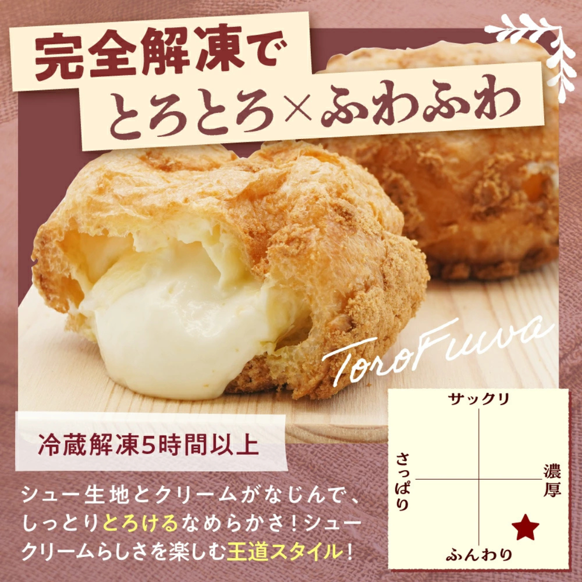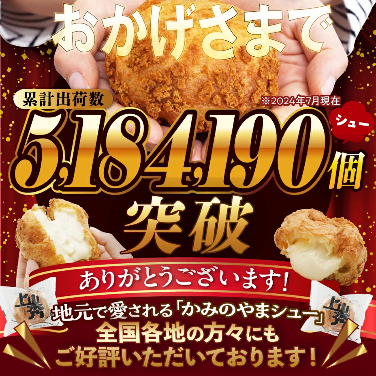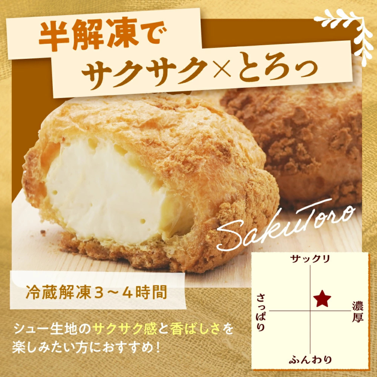 かみのやまシューは、山形県産つや姫米粉を使用したシュー生地に、やさしい甘さのカスタードクリームをたっぷり詰めた定番スイーツです。焼き上げ後すぐに冷凍することで、おいしさをそのまま閉じ込めました。