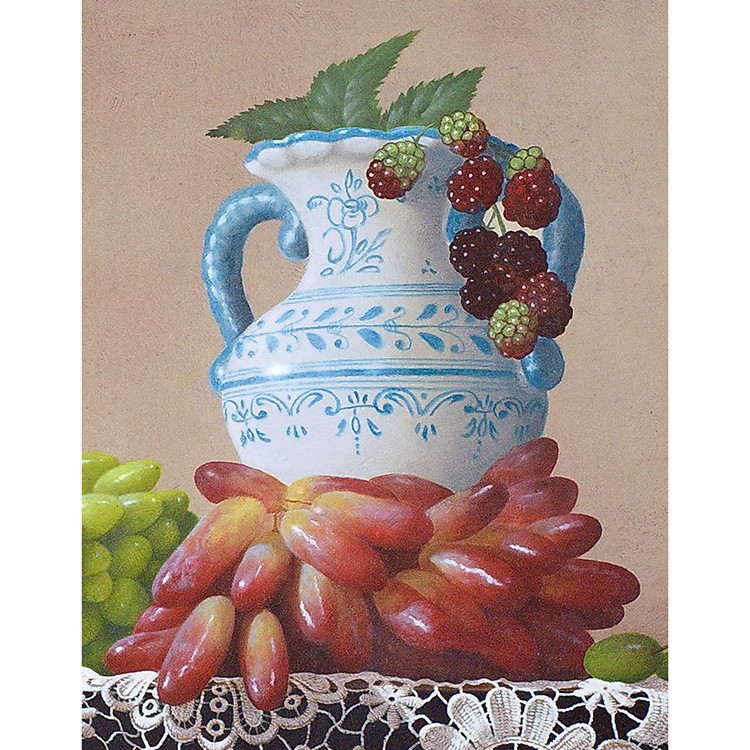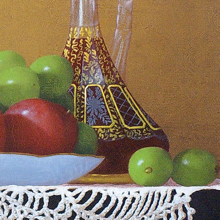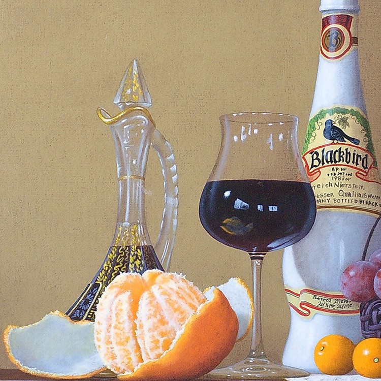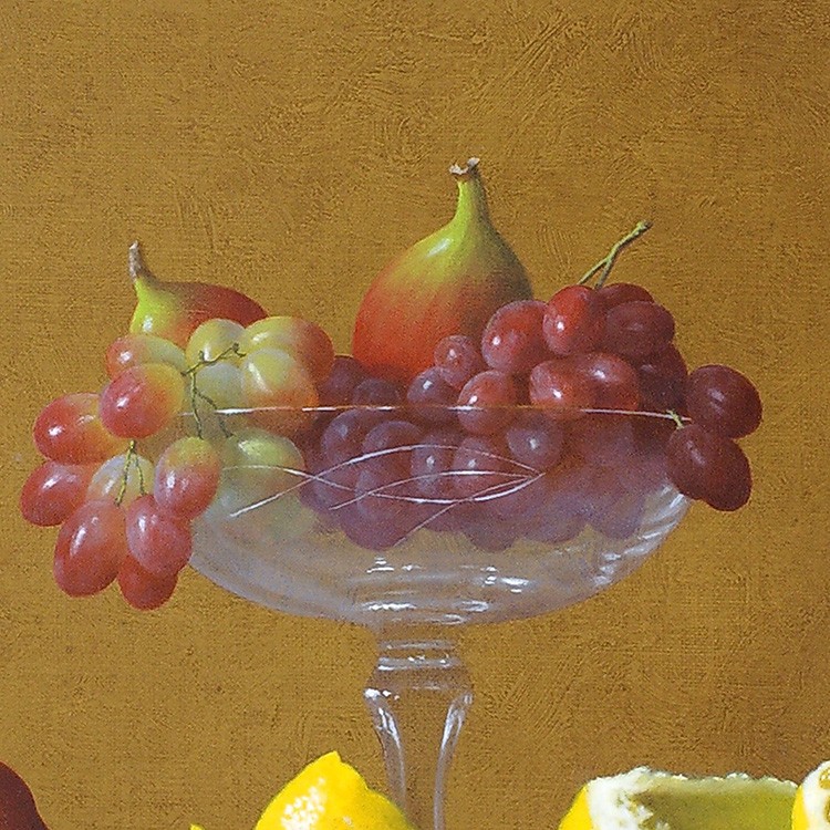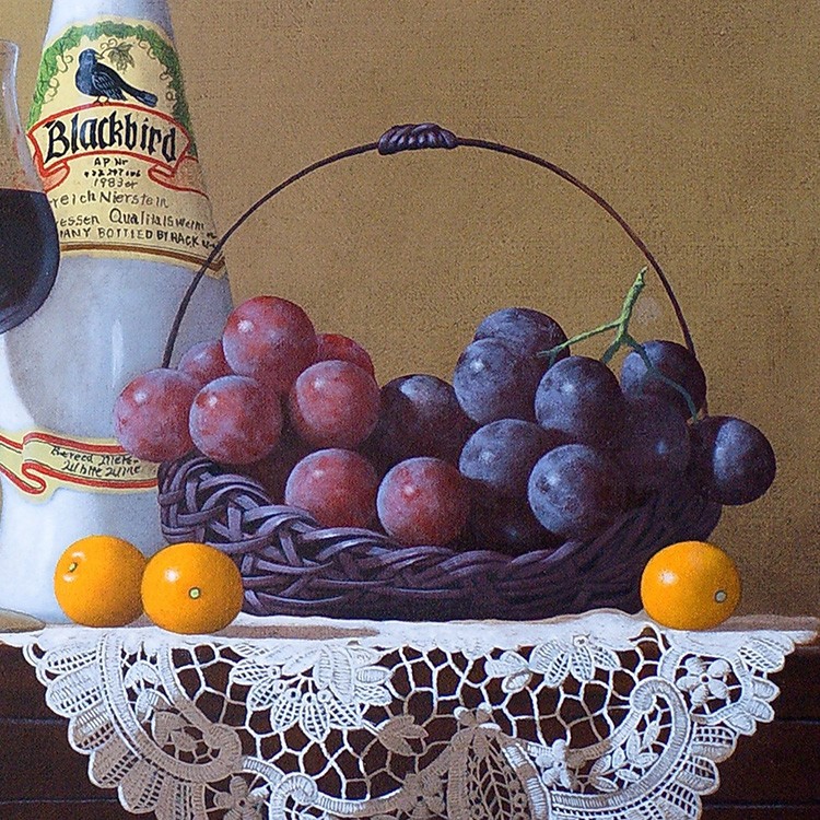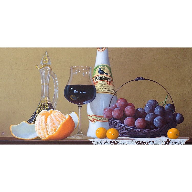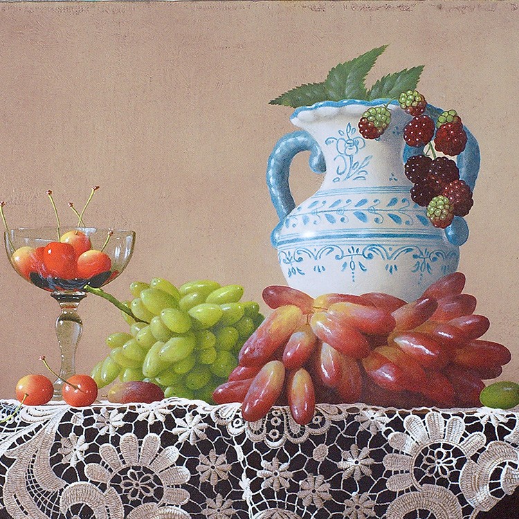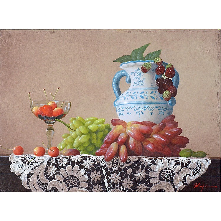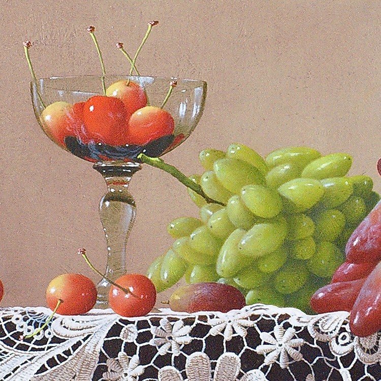 作品のメインの登場人物(果物)は2種類のブドウ、サクランボ、そして木苺。青系のブドウはピッテロビアンコ、赤系はマニキュアフィンガーか。いずれにしてもそう馴染みのない珍しい品種だ。カクテルグラスにはサクランボが、そして木苺がヴィンテージ風の両手付きの花瓶からこぼれ描かれている。庄司氏の描く果物はとても瑞々しく繊細で、宝石のような光沢を放っている。さらに庄司作品には必ず登場する名バイプレーヤー、白い手編みのレース。光と影の表情が、本作においてもさすがで、観るものを魅了する逸品である。