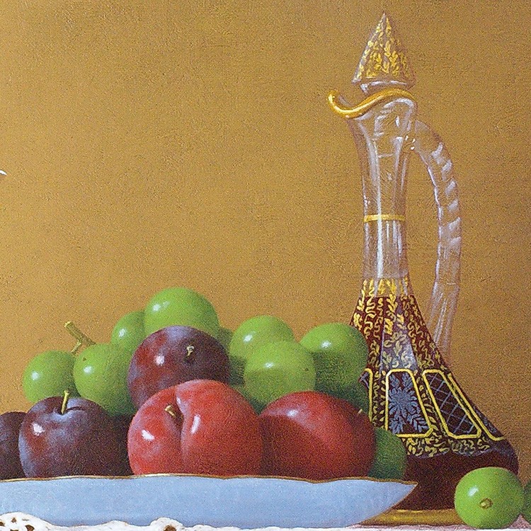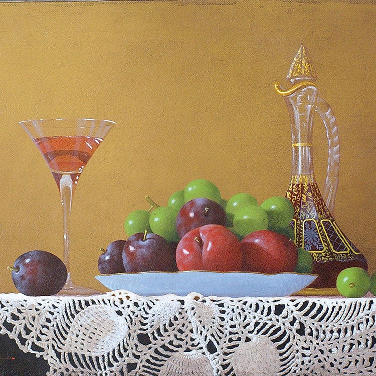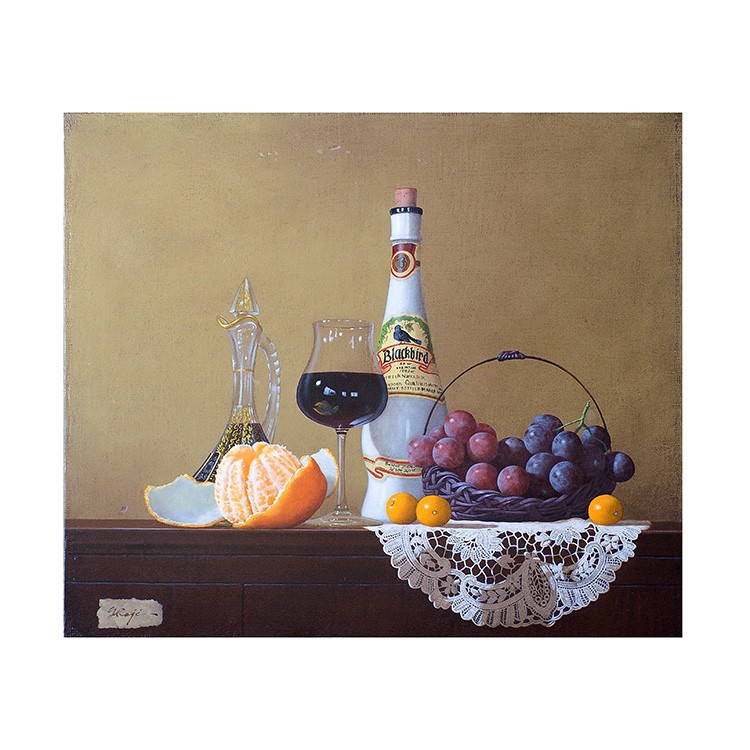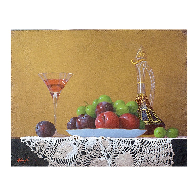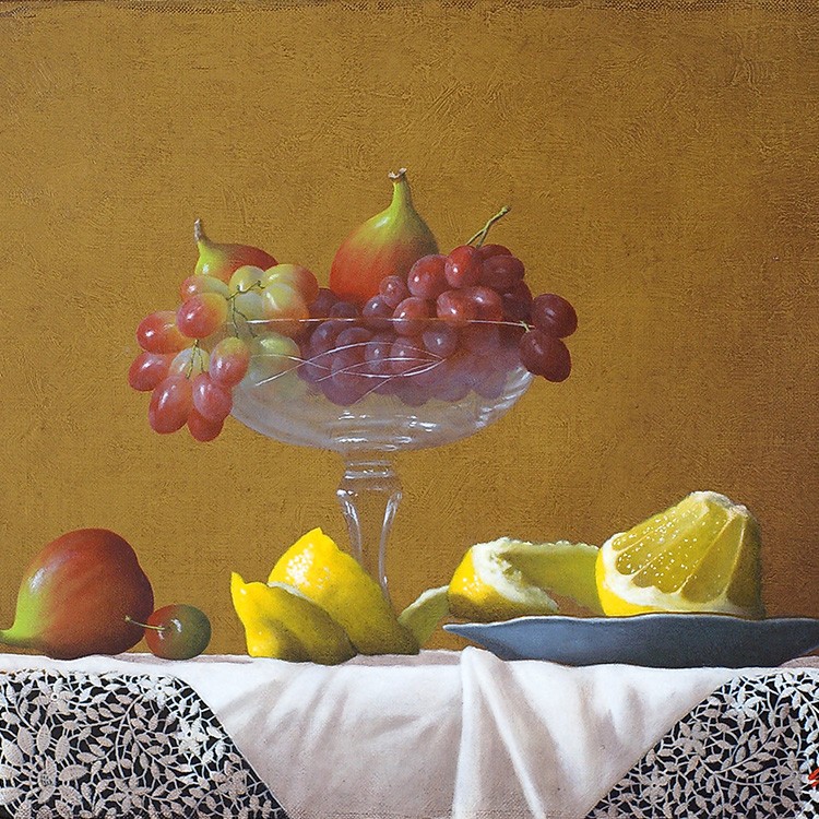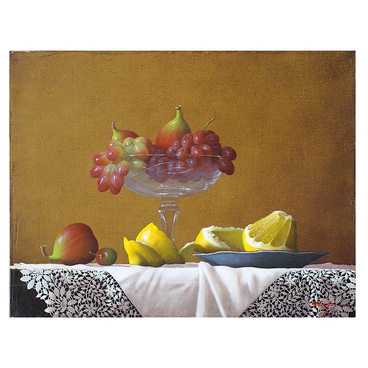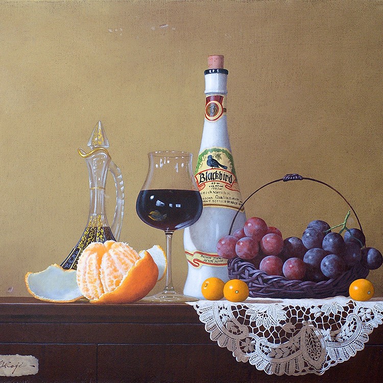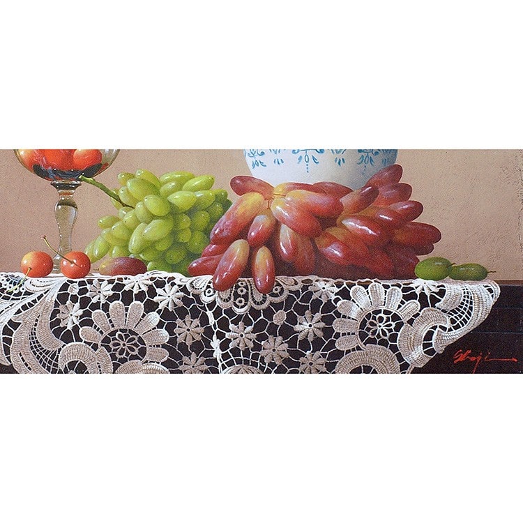庄司守の描く静物画には葡萄が多く登場するが、そのいずれもが気品高く美しい。 そして葡萄をさらに崇高なものにしているのがテーブルにかけられたレースの敷物。 繊細で複雑、明と暗の光の表情を持つレースは、脇役でありながら主役級の存在感を示している。 シャインマスカットもレースも、ともに庄司氏の作品を代表するようなアイコン的存在。 本作は、氏のメインモチーフのみが描かれた王道を行く作品である。 年齢を感じさせない庄司氏の作品。写実絵画界の重鎮として今もなお精力的に制作活動を行っている。