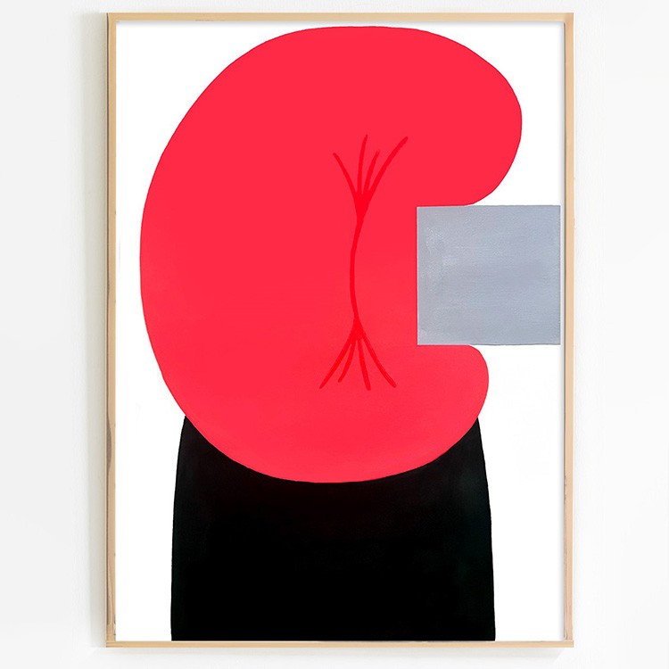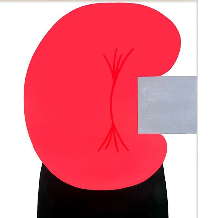 タイトルの『10/8スキップ 』は「10月8日」のこと。 10月8日の「その日の感情」「その日思ったこと、起きたこと」を作品で表現している。 ターコイズブルーとショッキングピンクだけで表現された作品は爽やかで軽やか。 右肩上がりに描かれたホースのような紐が作る三つの輪っかは「ホップ、ステップ、ジャンプ」と理解。 まさにタイトルそのままに、この日は“スキップ”をしたくなるほどうれしいことがあったのだろう。 説明不要、ワクワク楽しくなるハッピーな作品である。