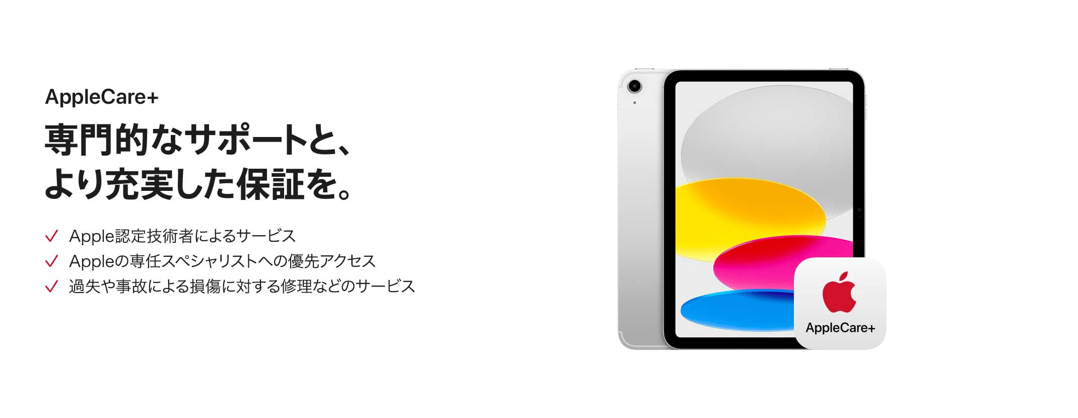 - すべてのiPadには、製品購入後1年間のハードウェア製品限定保証と90日間の無償テクニカルサポートがついています。AppleCare+に加入すると、iPad、Apple Pencil、Apple製iPad用キーボードの保証とサポートが延長されます。さらに、過失や事故による損傷に対する修理などのサービスを、1回につき所定のサービス料で利用回数の制限なく受けられます。Appleの専任スペシャリストにチャットまたは電話で優先的に問い合わせることもできます。詳細については規約をご覧ください。