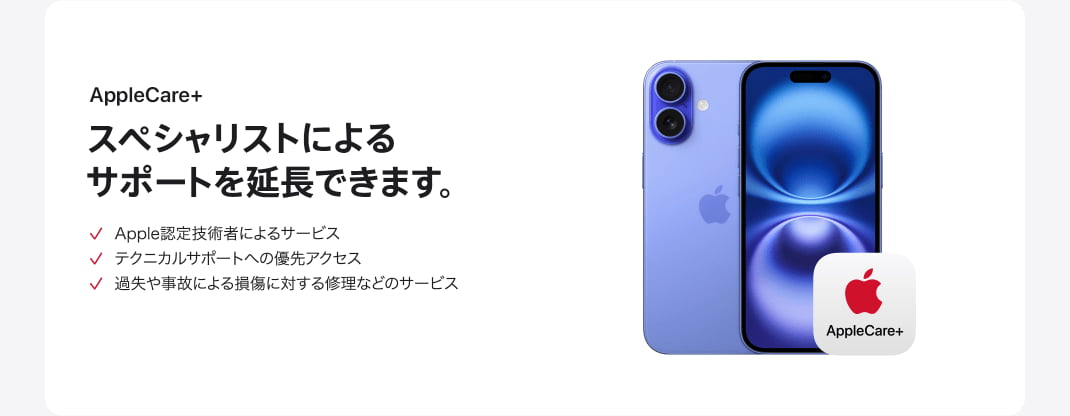 - すべてのiPhoneには、製品購入後1年間のハードウェア製品限定保証と90日間の無償サポートがついています。保証とサポートが延長され、過失や事故による損傷に対する修理などのサービスを利用回数の制限なく受けられます。