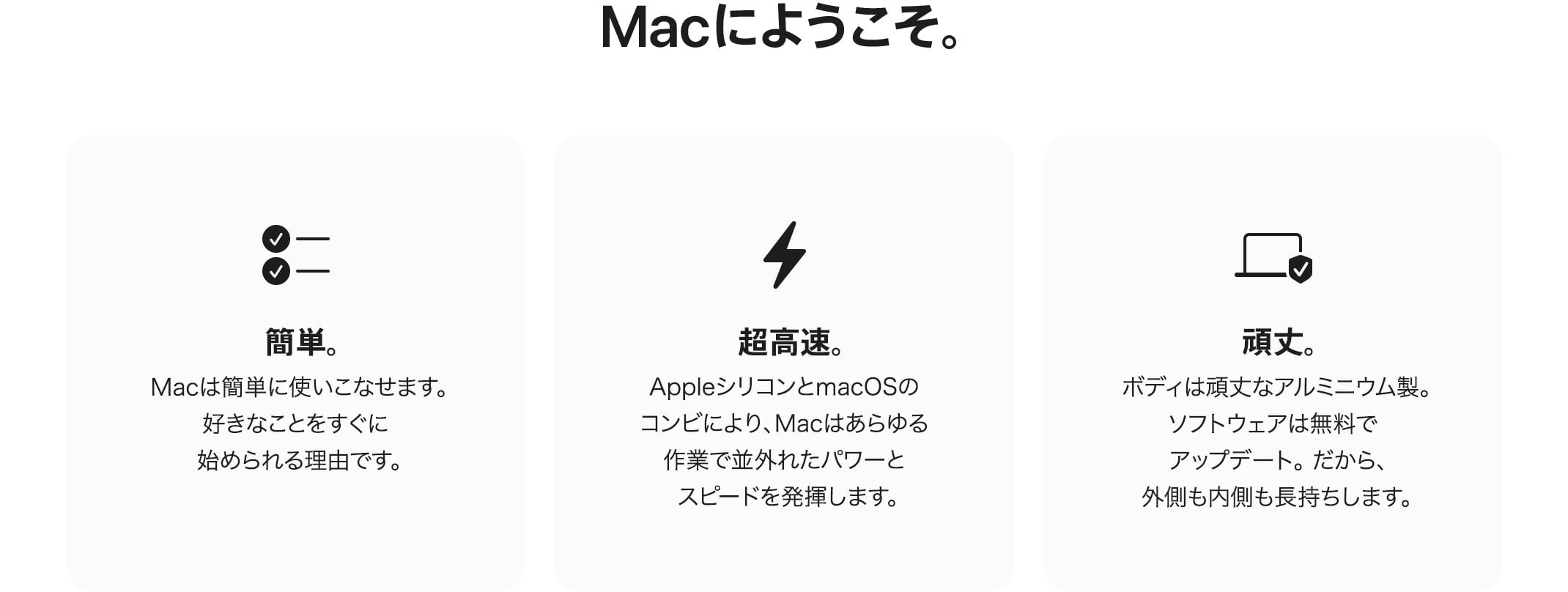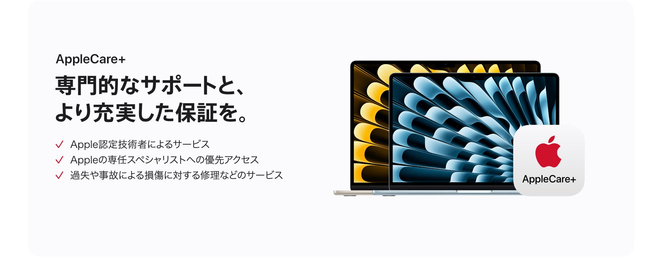 - すべてのMacには、製品購入後1年間のハードウェア製品限定保証と90日間の無償テクニカルサポートがついています。AppleCare+ for Macに加入すると、保証とサポートがAppleCare+の購入日から延長されます。さらに、過失や事故による損傷に対する修理などのサービスを、1回につき画面または外部筐体の損傷は12,900円(税込)、そのほかの損傷は37,100円(税込)のサービス料で、利用回数の制限なく受けられます。Appleの専任スペシャリストにチャットまたは電話で優先的に問い合わせることもできます。
