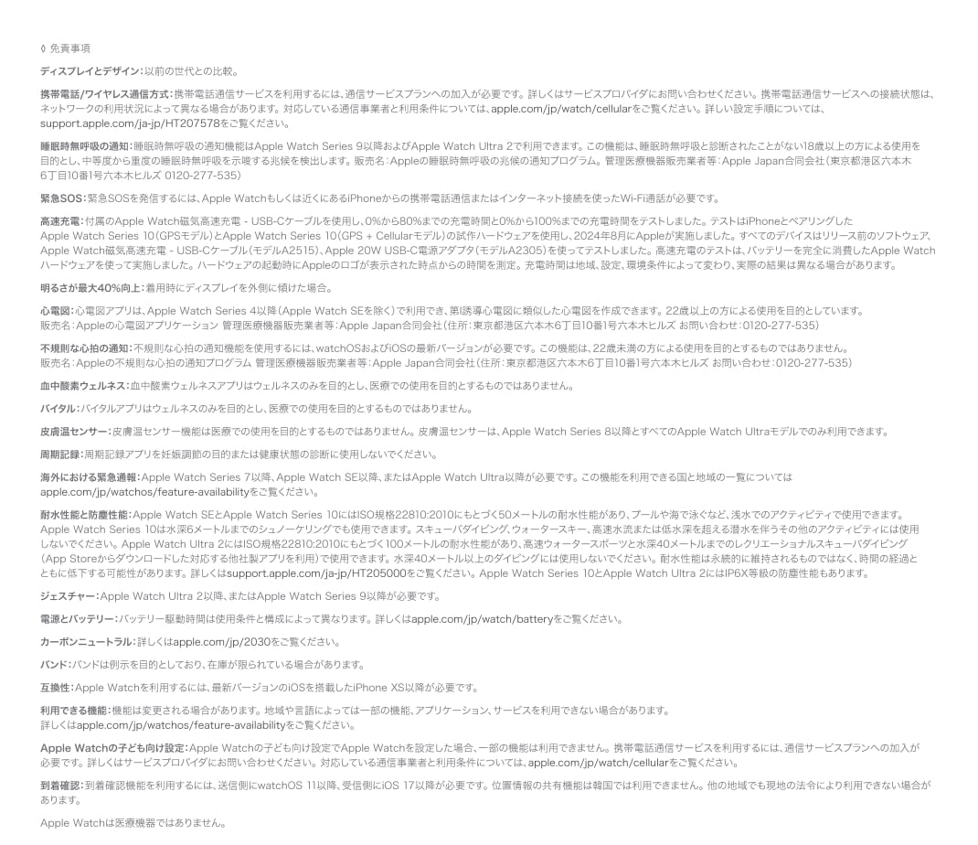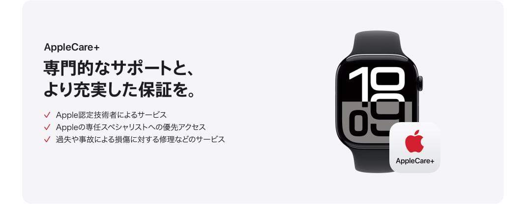 - すべてのApple WatchとApple Watch Ultraには、製品購入後1年間のハードウェア製品限定保証と90日間の無償サポートがついています。AppleCare+ for Apple Watch、またはAppleCare+ for Apple Watch Ultraに加入すると、保証とサポートが延長されます。さらに、過失や事故による損傷に対する修理などのサービスを、1回につきApple Watchは9,200円、Apple Watch Ultraは10,700円のサービス料で、利用回数の制限なく受けられます。Appleの専任スペシャリストにチャットまたは電話で優先的に問い合わせることもできます。詳細については規約をご覧ください。