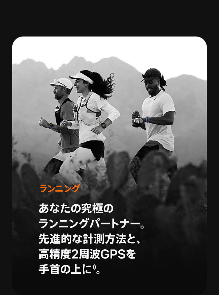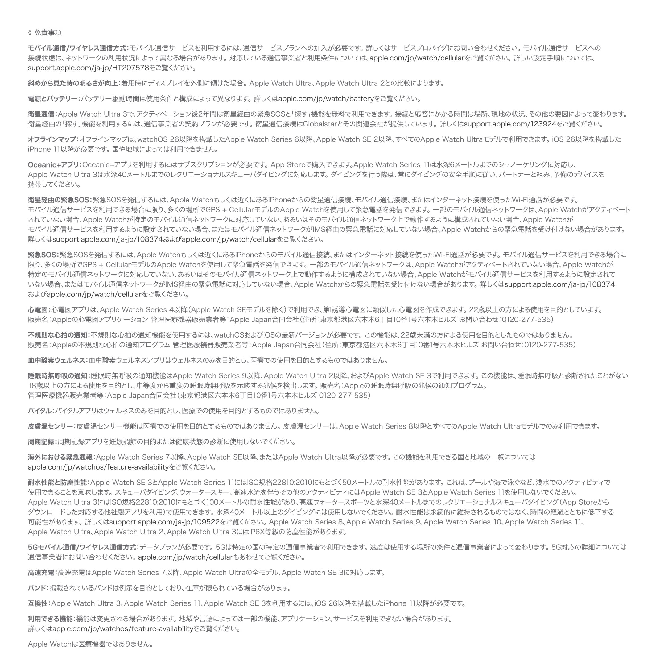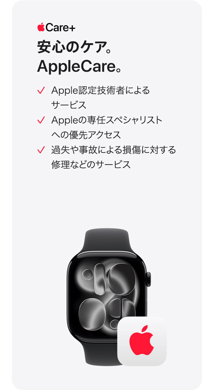 すべてのApple WatchとApple Watch Ultraには、製品購入後1年間のハードウェア製品限定保証と90日間の無償サポートがついています。AppleCare+ for Apple Watch、またはAppleCare+ for Apple Watch Ultraに加入すると、保証とサポートが延長されます。さらに、過失や事故による損傷に対する修理などのサービスを、1回につきApple Watchは9,200円、Apple Watch Ultraは10,700円のサービス料で、利用回数の制限なく受けられます。Appleの専任スペシャリストにチャットまたは電話で優先的に問い合わせることもできます。詳細については規約をご覧ください。