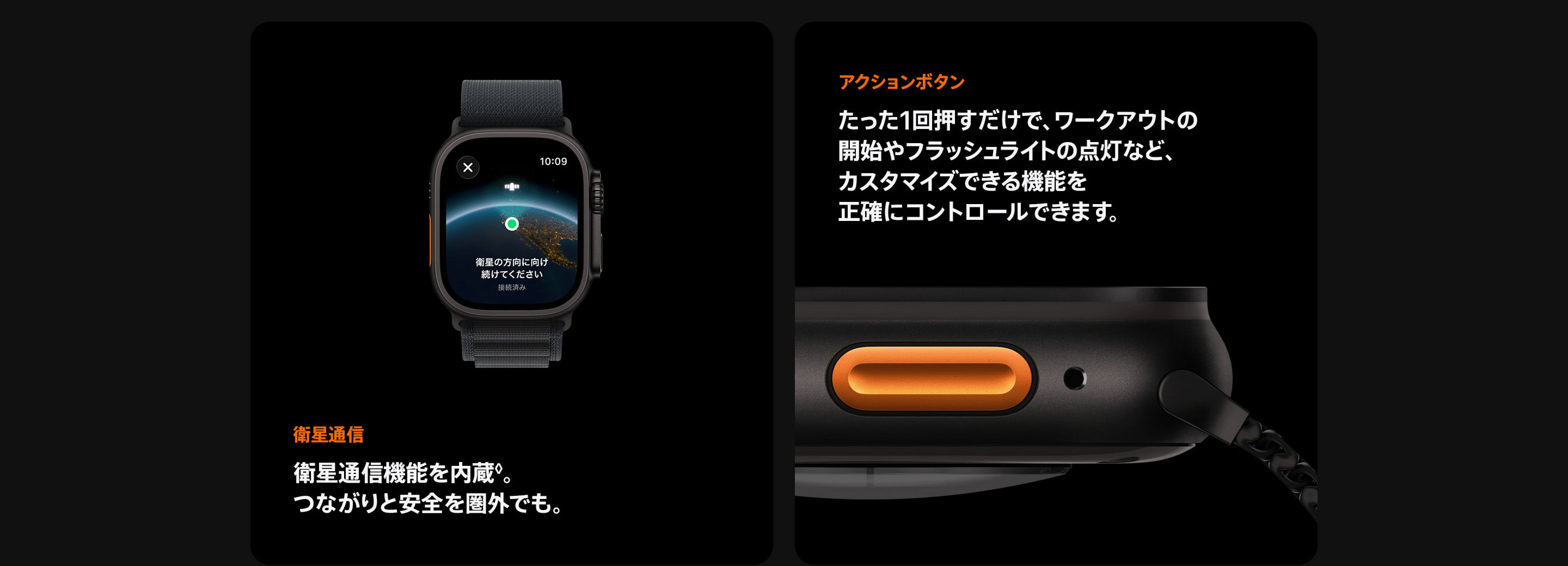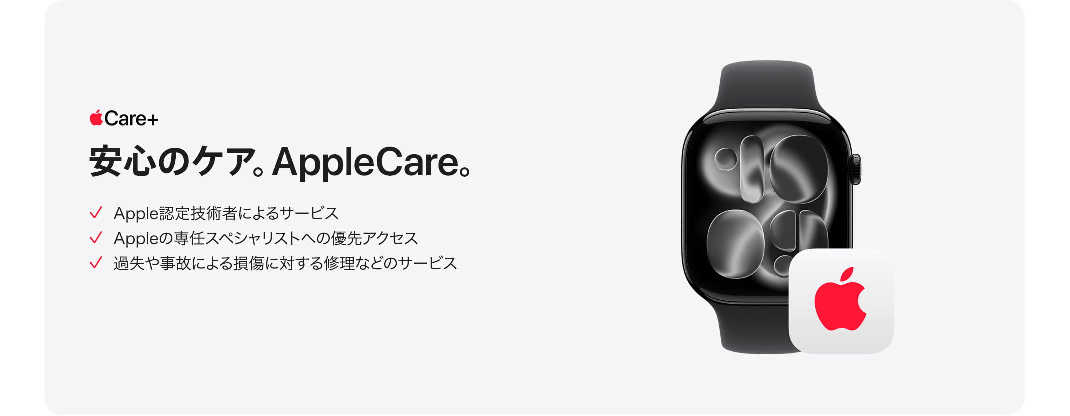 - すべてのApple WatchとApple Watch Ultraには、製品購入後1年間のハードウェア製品限定保証と90日間の無償サポートがついています。AppleCare+ for Apple Watch、またはAppleCare+ for Apple Watch Ultraに加入すると、保証とサポートが延長されます。さらに、過失や事故による損傷に対する修理などのサービスを、1回につきApple Watchは9,200円、Apple Watch Ultraは10,700円のサービス料で、利用回数の制限なく受けられます。Appleの専任スペシャリストにチャットまたは電話で優先的に問い合わせることもできます。詳細については規約をご覧ください。