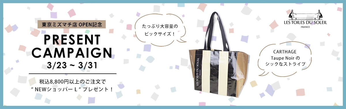 期間中、税込8,800円以上お買い上げのお客様に、シックなストライプ柄が魅力の「キャルタージュ トープ ノアール / CARTHAGE Taupe Noir」の新デザインショッパーLサイズ(税抜1,200円相当)を1点プレゼントいたします。