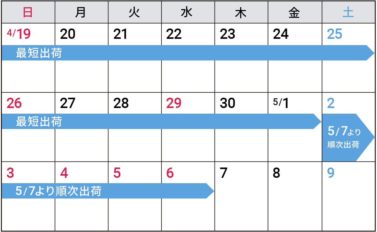 ゴールデンウィーク中は下記カレンダー通りの出荷を予定しておりますが、 ご注文集中や交通事情によりやむを得ずお届けにお時間をいただく場合がございます。